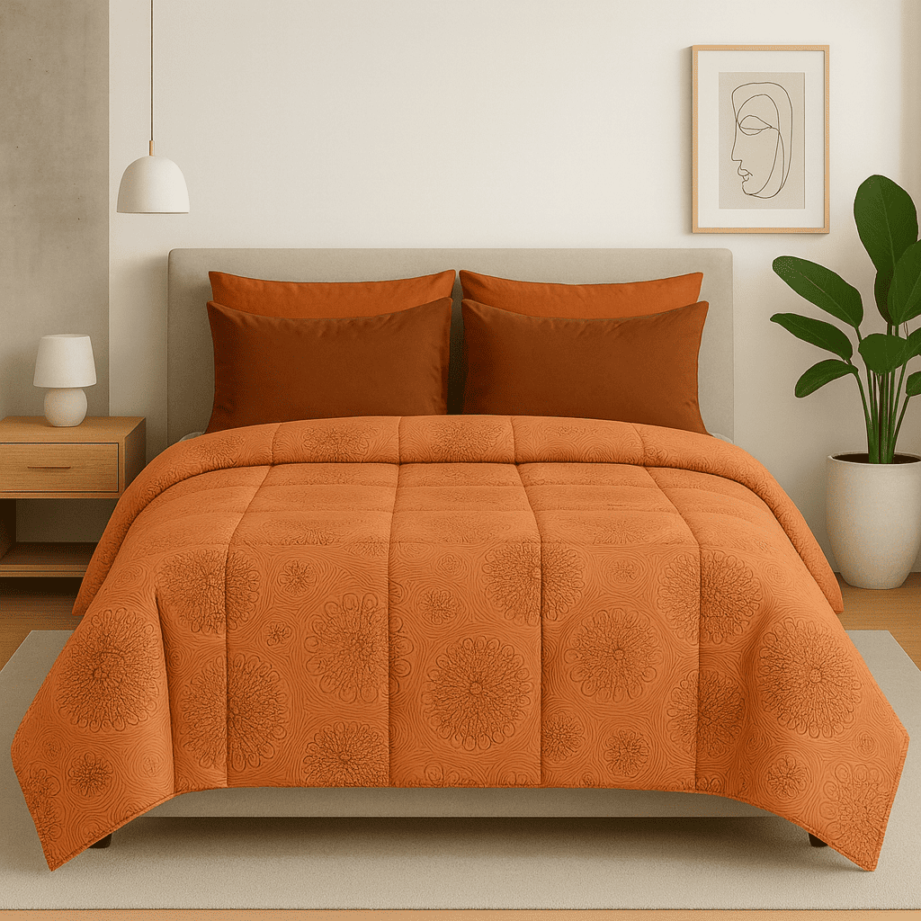 Δώστε στην κρεβατοκάμαρά σας την κομψότητα και τη ζεστασιά που της αξίζει με το διπλό Κουβερλί Mojo της σειράς Love Home. Σε γήινη πορτοκαλί απόχρωση με διακριτικά κυκλικά μοτίβα, αποπνέει αίσθηση πολυτέλειας και μοντέρνου χαρακτήρα, ενώ ταυτόχρονα προσφέρει απόλυτη άνεση για έναν χαλαρωτικό ύπνο.