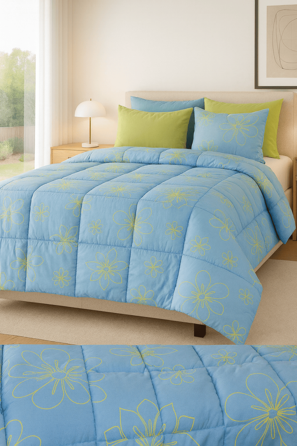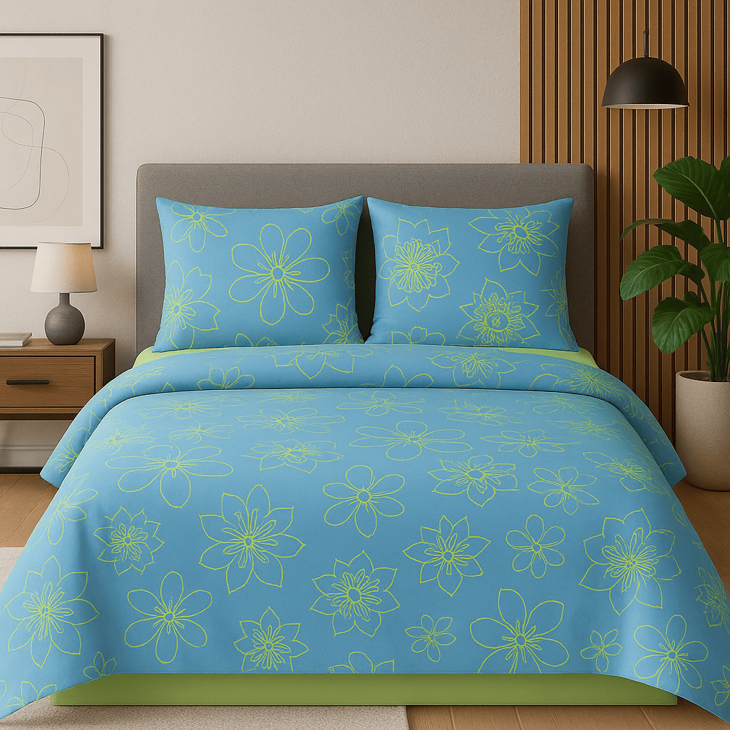 Το εκλεπτυσμένο τιρκουάζ χρώμα σε συνδυασμό με τα λαχανί λουλούδια δημιουργεί ένα ζωηρό αλλά και κομψό αποτέλεσμα, που δίνει φρεσκάδα και μοντέρνα πολυτέλεια σε κάθε κρεβατοκάμαρα.