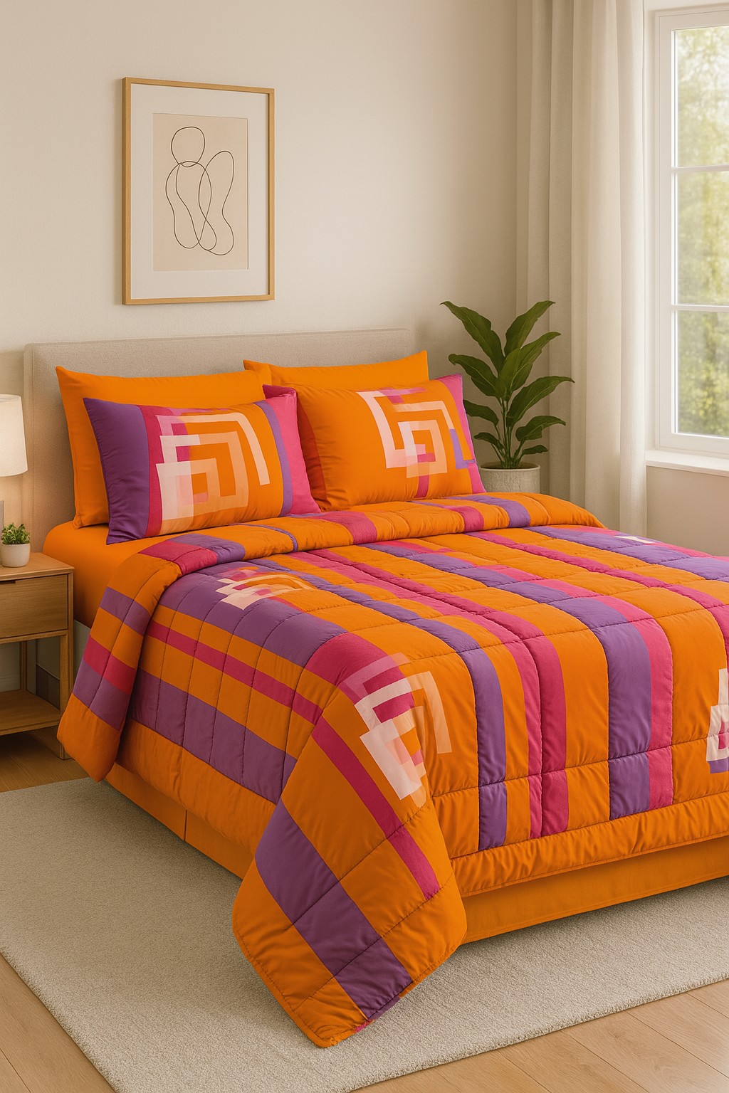 Ανανεώστε την κρεβατοκάμαρά σας με το υπέρδιπλο πάπλωμα 220×240 της σειράς Colors από τη Love Home. Ο μοντέρνος σχεδιασμός του συνδυάζει ζωντανά χρώματα σε τόνους πορτοκαλί, μωβ και ροζ, δημιουργώντας ένα δυναμικό γεωμετρικό μοτίβο που δίνει φρέσκια και κομψή αισθητική στον χώρο σας.