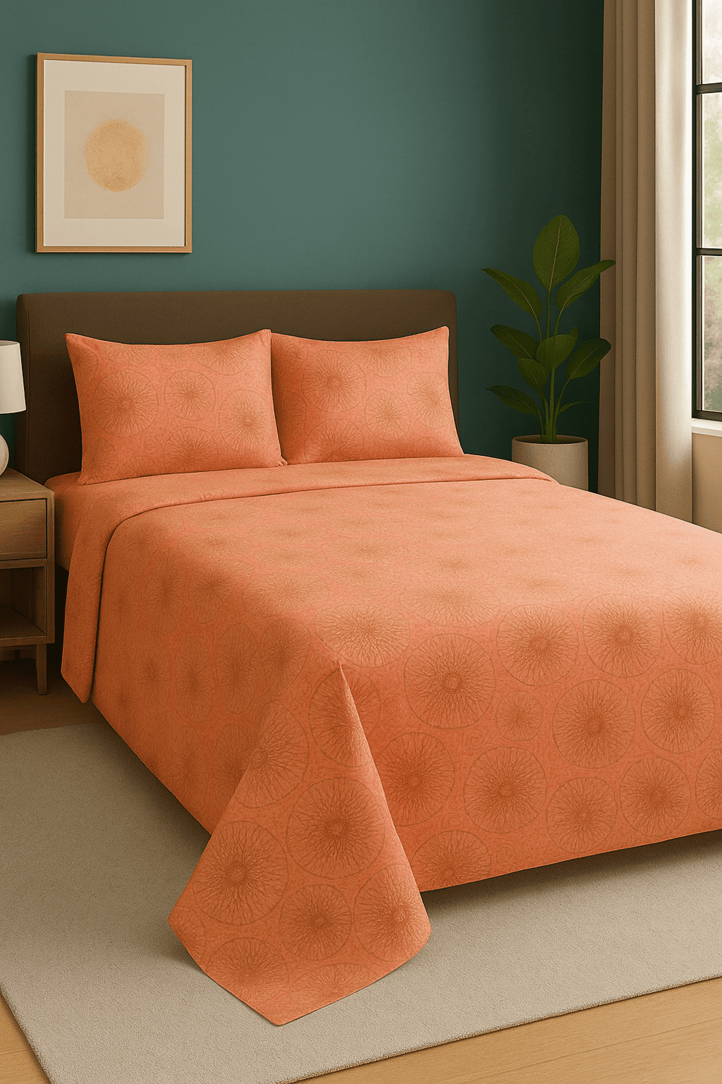 Σε γήινη πορτοκαλί απόχρωση με διακριτικά κυκλικά μοτίβα, αποπνέει αίσθηση πολυτέλειας και μοντέρνου χαρακτήρα, ενώ ταυτόχρονα προσφέρει απόλυτη άνεση για έναν χαλαρωτικό ύπνο.